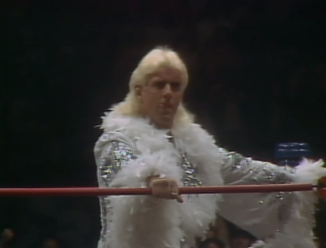 Sting has the temerity to work over the legs, as he’s trying to set up the Scorpion Deathlock. This baits Flair into going after the legs and setting up his own submission; the Figure Four leglock.