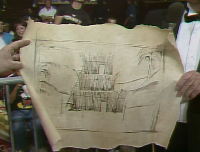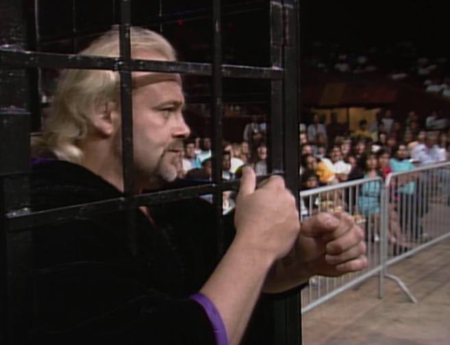 BEHOLD! The latest fever dream of a concept from the mind of Dusty Rhodes. The Tower of Doom. A triple cage, with trap doors in between levels. Tony has a hell of a time trying to explain it.