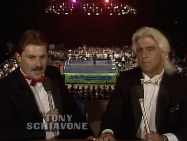Video Control takes us to Tony Schiavone who interviews “Big” John Ayers, an NFL player, who stumbles over his words so badly Ric Flair has to take over the promo. Ayers is horrible on the mic. He has a history in the business, incredibly, as he was an onscreen figurehead for Bill Watts’ UWF. In his NFL days he was an offensive guard who won two Superbowls with the 49ers. He passed away in 1995 of liver cancer.