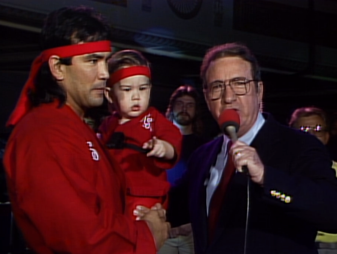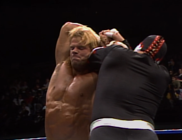 Oh no. Why would you do this? Luger is about to face Barry Windham, so Hiro Matsuda has gone out to get dirt on Luger and apparently this man has it? (I have no idea, it’s not explained. Basically, it’s just a guy to wear Luger down ahead of the match.) The man in question is Jack fuckin’ Victory AGAIN. This time under another mask. Here’s how this should go down; Luger beats the piss out of Victory and Matsuda. Racks Victory for the win in like 90 seconds, then racks Matsuda. Windham runs out for the save and kicks his ass to set up the match.