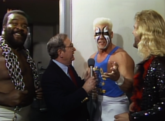 The Steamer comes out for a chat, which is basically Flair verbally abusing him while trying to get over his new corporation. Steamboat, family man, says he hates everything Flair stands for. Which is why the feud worked outside of the match quality. Steamboat was a nice guy babyface who didn’t show off. Flair was all rolexes, private jets, hookers and blow. It is far easier to hate rich people when they show their riches. They get into it and Steamboat ruins Flair’s $1500 suit. Oh man, the CHOPS here are so good. This is a ****¼ brawl. The match is only five days away!