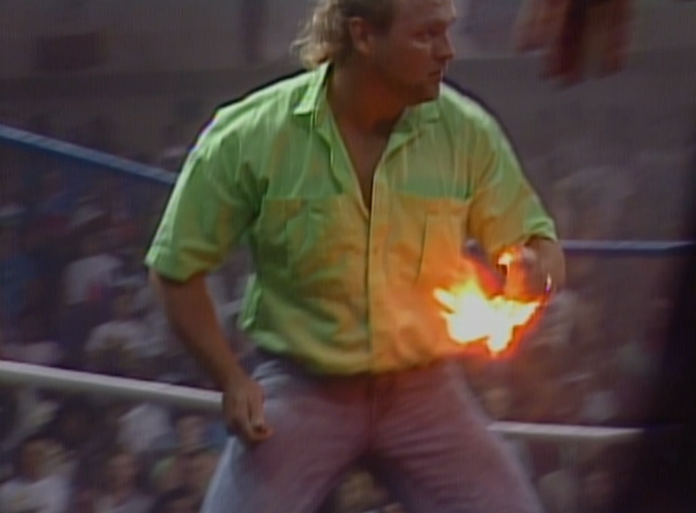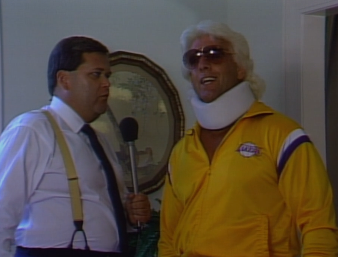Video Control gives us footage of Terry Funk assaulting Ric Flair after his title victory at Wrestlewar. A very sweaty Jim Ross talks a bit about it. If he whips that jacket off, you’re going to see some big old sweat patches.