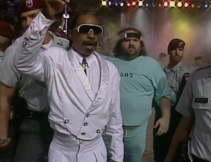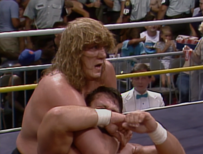 The Freebirds certainly draw a lot of heat with their antics. PS Hayes, in particular, is capable of winding up drunk soldiers. The match has a lot of segments where guys get isolated before MXP break out the double teams. Gordy sneaks in, powerbombs Eaton, and Garvin gets the pin for the belts. Nice to see a powerbomb. 1989 is when big power moves started involving lifts. Hopefully the United States renames today’s holiday Fabulous Freebirds Flag Day in their honour.