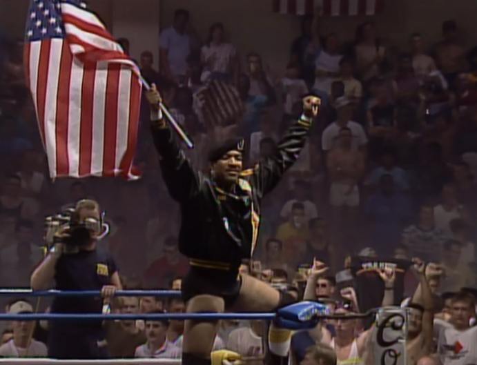 “This is real America here. I’d like to be drinking a Coors Lite and eating a slice of Domino’s pizza” says Jim Ross, which is a totally normal thing to say, and not a required sponsorship ad read. Ross (Ranger, not Jim) looks dreadful here doing patriotic karate and he finishes with the Combat Kick in about a minute. This was like watching Goldberg if Goldberg was 78% more clumsy.