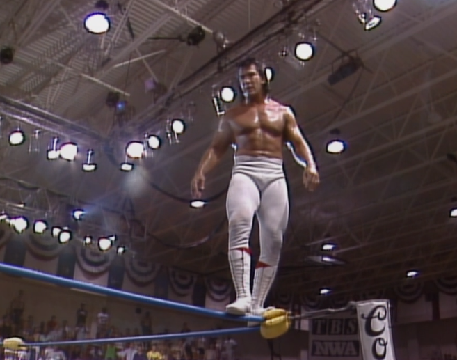 Promo Time: Freebirds. Jimmy Garvin, rather than Michael Hayes, draws the heat. We go right from that to clips of “Flyin’ Brian”, who’s on his way to the NWA. It’s a weird video, mostly of Pillman lifting weights.