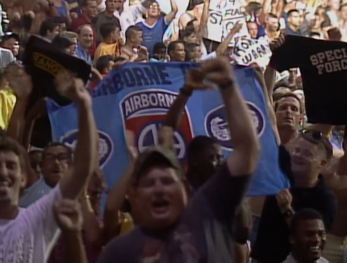 We have a raucous (/drunk) crowd full of army types. HOO-RAH! Jim Ross is all “yeah, spend your summer training and you too could have career in the army instead of lounging around on the beach. Get shot at by brown people. Come home in a body part or in parts. Yes, it’s a man’s life in the army”. He also implies Missy Hyatt fucked a few of the soldiers. What a treat for the troops! Ranger Ross is an obvious poster boy for this whole thing. Every day is Flag Day when you’re Ranger Ross.