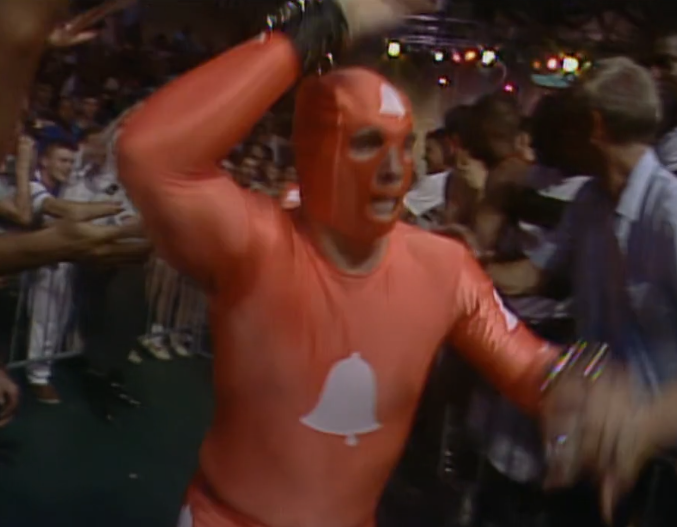 Jim Herd’s latest idea is a doozer. So, he created a concept where there was a tag team of hunchbacks, who could never lose because you couldn’t pin them. I’m sure this sounded great in his head. Where would you even find two hunchbacks? Anyway, Ole Anderson talked him out of it, and we were left with this dazzling concept. Two masked guys who like bells.