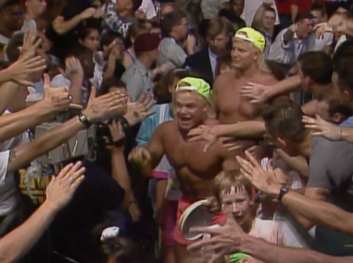 This crowd rules. Maybe Jimmy Herd was onto something here. Hayes struts once and they’re pelting the crowd with garbage. It’s a dream! It’s a shame they get this match with this heat. It’s all backwards. I don’t know what you’ve heard about the Dynamic Dudes but they fucking suck. Hand-slapping babyface Shane Douglas doesn’t compute and Johnny Ace is so bad he had to make a career in Japan where personality wasn’t required.