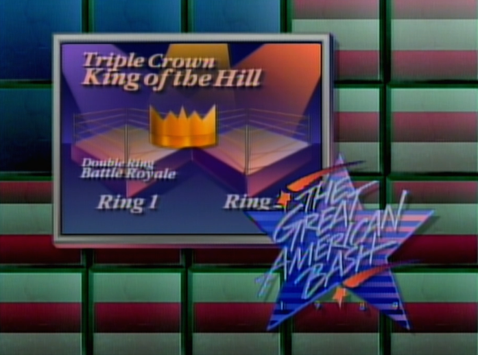 We also learn about this Triple Crown King of the Hill concept. Which is a bit like World War III in an early form. Basically, if you get chucked out of ring one you go into ring two. The last guy in ring one then wrestles the last guy in ring two. The World War III concept was this ramped up with 60 guys in two rings, until that number dwindled down and they all piled into a third ring. Both concepts are needlessly complicated and clearly everyone at Turner was upset the WWF lads thought of the Royal Rumble first.