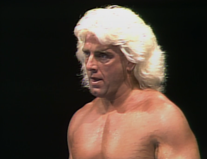 Flair sees the change in momentum and takes it to the floor, where he’s useful and capable of utilising the environment. Something Steamboat, a baby blue, would never consider. So, he gets whipped into a bunch of guardrails. That’ll teach him. The match starts to get tiring after this. The idea is that Steamboat is getting tired, and Flair starts forcing him to work hard. Lots of shortcuts and bullshit. He’s cheating to get the fans to rally behind Steamboat and his comeback. In all honesty, Steamboat was never that over. He was a great, elite wrestler, but people never really cared about him. Watch a Steamboat match without someone like Flair or Savage to bounce off.