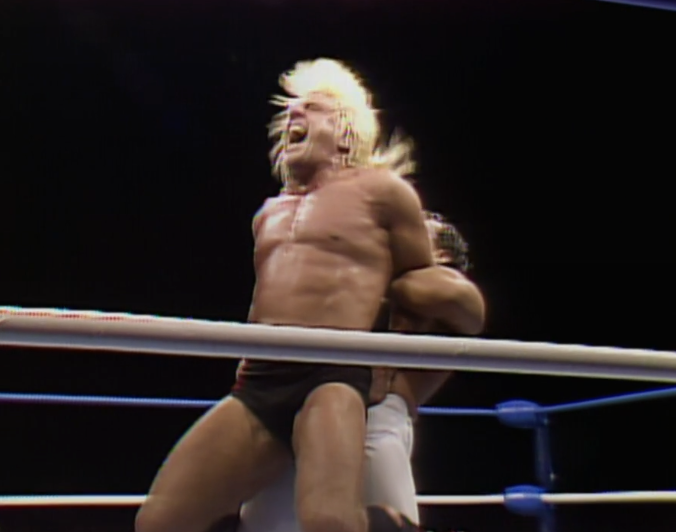 Flair goes after the leg and hooks the Figure Four. Steamboat looks fucked and Terry waxes lyrical about how it’s harder to quit when quitting means losing a world title. Steamboat somewhat overdoes the fatigue selling, as he must combine it with a limp. The lack of movement allows Flair to do his corner bump. It shows that Steamboat has lost half a yard. They also establish that he can’t lift Flair without the knee giving out. This is a Chekov’s Gun for later.