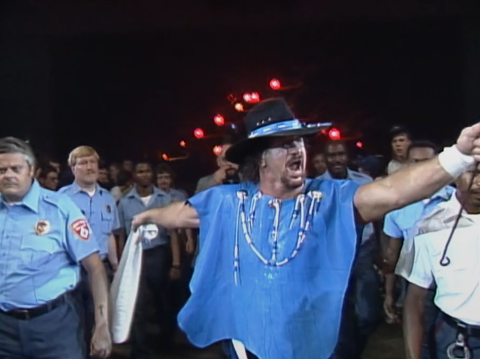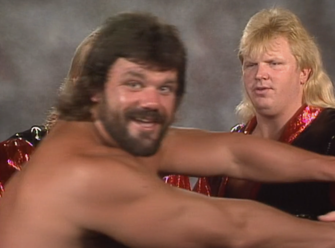 They ran qualifiers for this fucking thing. Competitors are Kevin Sullivan, Mike Rotunda, Bill Irwin, Ron Simmons, Flyin’ Brian, Scott Hall, Ranger Ross, Rick Steiner, Eddie Gilbert, Steve Williams, Terry Gordy, Scott Steiner and, finally, the Skyscrapers. Oh, shit, we’re into the era of SID.