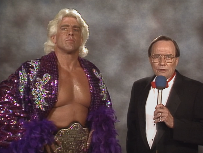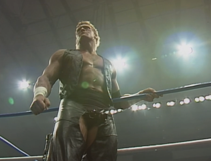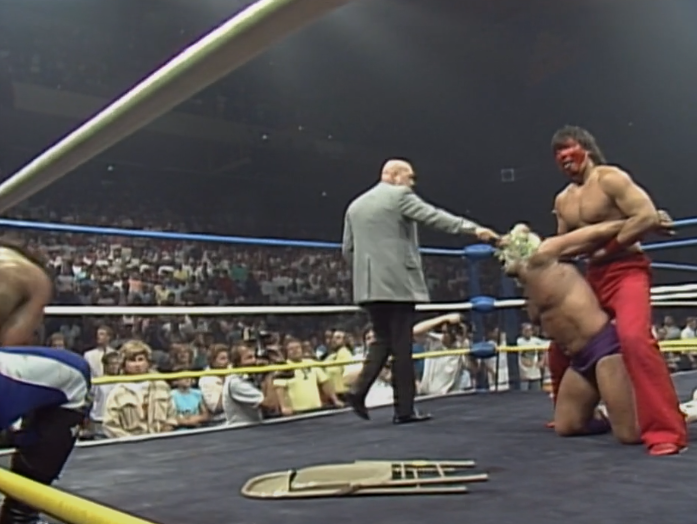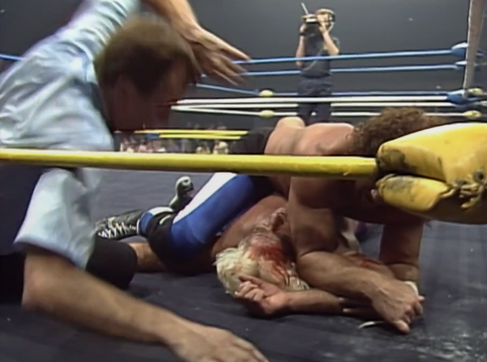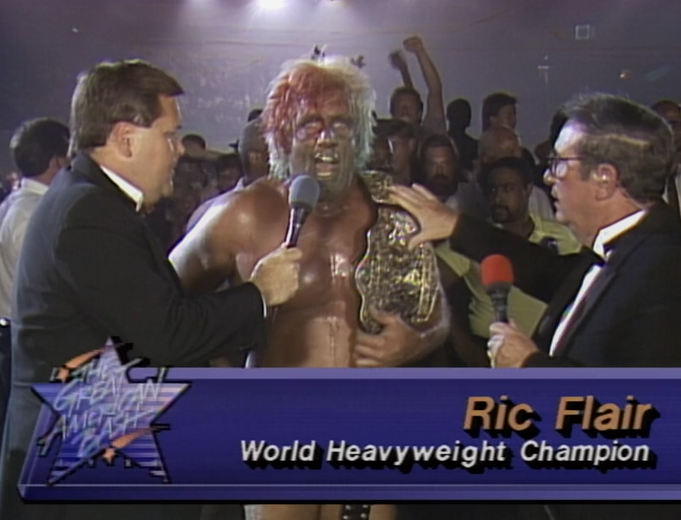 Post Match: It ain’t over! Flair decks Gary Hart but Great Muta comes in and mists the champ. Funk proceeds to beat Flair mercilessly and Muta even whacks Flair with the belt.