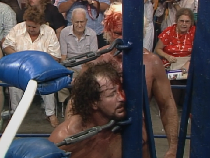 Gary Hart tries to give Funk an advantage, but Flair steals the branding iron and whacks Terry across the head. He’s lacerated too!