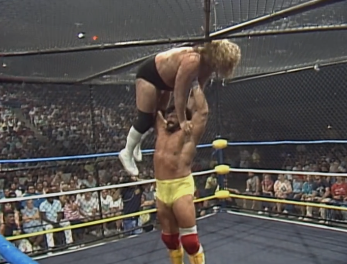 Hawk’s revenge sees him beat the piss out of every single heel. Including a huge dive from one ring to the other. Unlike Animal, he doesn’t grab the ropes. He just flies over. Paul E’s attempts to get the phone into the ring, which won’t fit through the cage, is a good laugh while all this is going on. Hawk goes after Garvin and gets him in the Hangman’s Noose neckbreaker for the submission. This was fine for War Games. There was no blood but a few cool spots. In all honesty, the shine has come off the concept already and I’ve stopped enjoying them. It was fine. ***