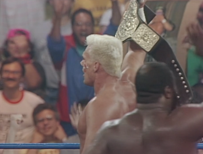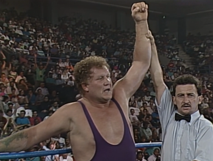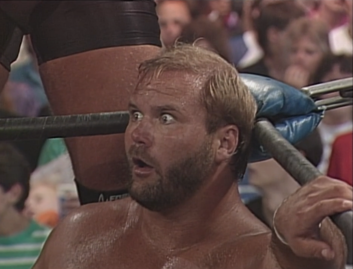 Speaking of change; the Freebirds wrestle like we’re still in the territory days here, going after heat and stalling. It’s a shame they don’t just kick lumps out of each other all match because Hayes is stiff as all hell when he’s in there. JR tells us the Freebirds makeup would be popular “in some parts of San Francisco”. They have a hot finish where Garvin tries to hit a DDT but the referee notices he’s not legal and Rick sneaks in to lay out Hayes. Scott, who just hit Hayes with the Frankensteiner, gets the pin. There’s also great work from Hayes, who gets his foot on the rope but it’s clearly after the pin. **½. Good effort and extremely heated.