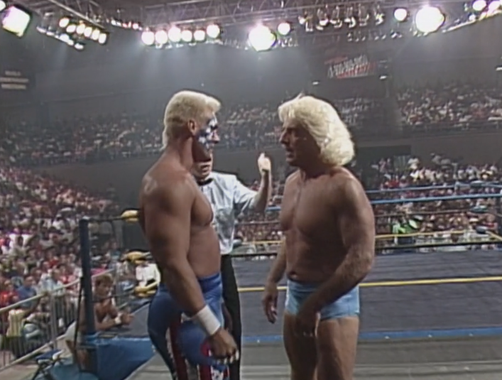 Scorpion Deathlock applied. The Horsemen run in but the Dudes with Attitude see them off. Sting starts smiling, just before hurting his knee, like he knows the finish is near. Flair goes after the Figure Four and Sting rolls him up for his first world title.