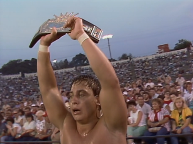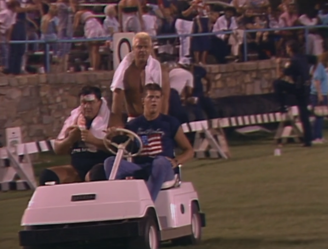Is an Indian strap match just a strap match with Wahoo in it? Yes, yes it is. Jimmy Garvin is the kind of weird body shape, oddball workers that you never get in WWE anymore. The company insists on a certain body shape and level of fitness. Not that I’m advocating for a Jimmy Garvin clone. He was one of a kind, and I’m glad. Garvin was, by all accounts, a nice fella outside of the ring. Married to his valet Precious since 1972, he’s a religious family man. On retiring from wrestling, he became a pilot. Strap matches are generally quite bad unless there’s at least one great worker in there. Garvin isn’t it. Both guys blade but the match lacks excitement. Coming on the back of a bloody Bunkhouse match doesn’t help. Wahoo collects buckles with his head, which I didn’t think was legal. Precious tries to waffle him with her purse in the process and he just shrugs it off. Wahoo wins, both guys bled buckets. That works for the locals. It doesn’t work for me.