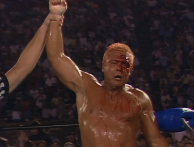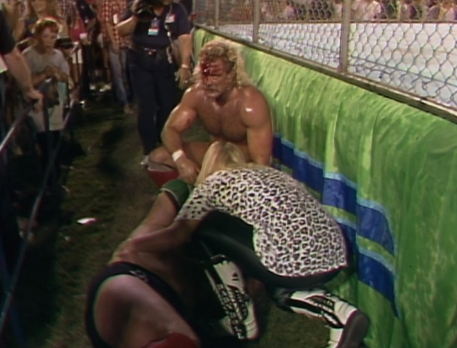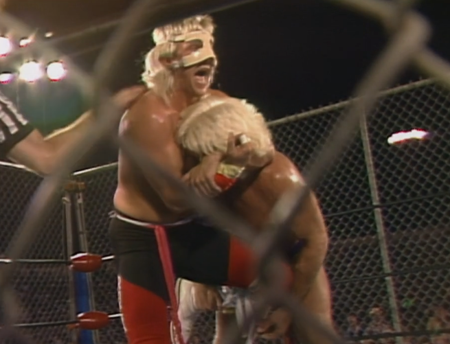 Morton starts working Flair’s prominent proboscis and he doesn’t take it well. “YOU MOTHERFUCKER” – Flair. This came about because Flair broke Morton’s nose, so turnabout is fair play. Flair, being a complete asshole, rips off the nose protector, wears it himself and smashes Ricky’s face into the cage. Naturally, Morton is a bloody mess. This is going to ruin his heart throb status. Mathematically, Starrcade ‘85 will remain the King of Bladejobs Show but we’re up to 12 here. Is it getting to the point where it’s too much? I don’t know, people seem to like it? Blood and guts, baby!