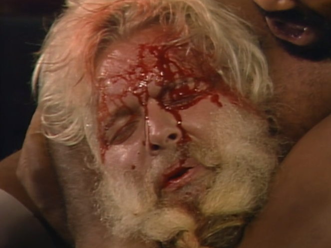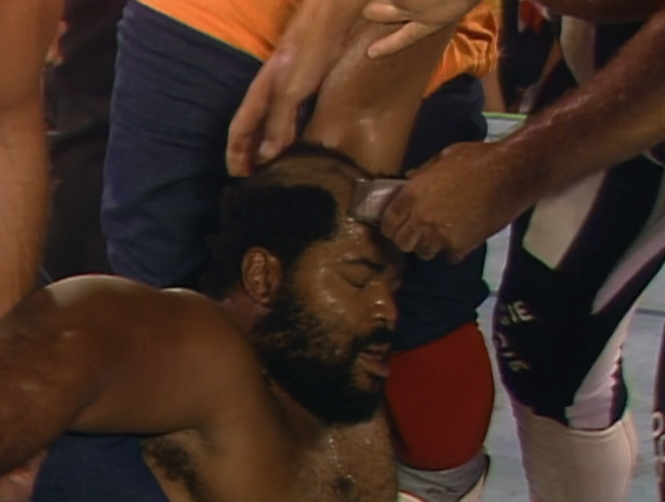 Valiant is a guy of his time and place. He’s a weird looking alien type that doesn’t look like he’s capable of beating anyone. He does the same awful, goofy stuff in every match. His offence and his selling are both weird. I usually give him a pass because he’s over but it’s hard to sit through longer Jimmy Valiant matches and this one passes the ten minute mark, which nobody wants. Valiant does find time to bleed (unlike Jesse Ventura), which takes us to eight bladejobs on this show.