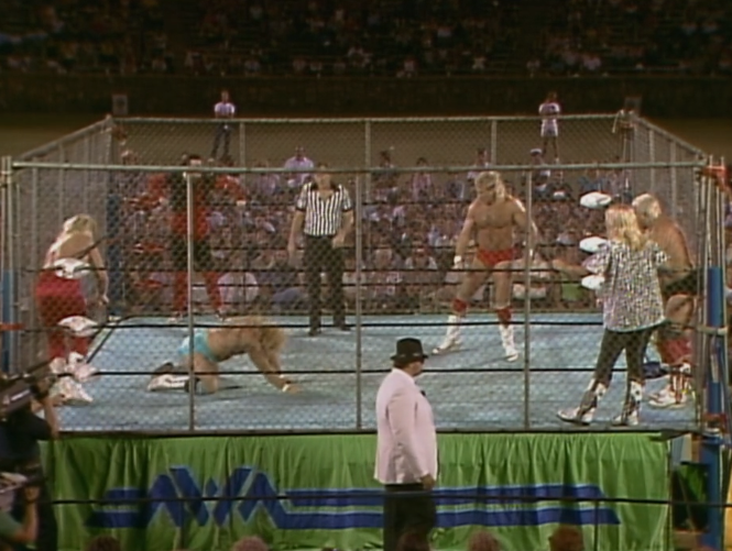 This is probably the first time I’ve heard a male/female reaction divide in the crowd. There’s a clear high-pitched reaction for Morton and the fellas like Flair. This version of Ric Flair is more sadistic and evil than usual. His usual approach is say he’s the best, get beaten up for 30 minutes and then win with his feet on the ropes. Here, he’s bloodied Morton and is rubbing his face into the cage while teenage girls scream. It’s a different Ric Flair. Tommy Young says “give him a chance” as Flair is setting up the Figure Four. Hey, he knew what he was getting into Thomas. I have no sympathy.
