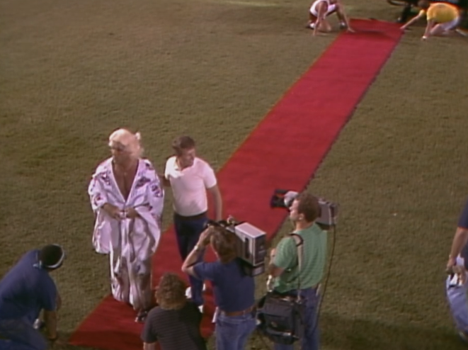 The helicopter lands, the champ steps out, walks that aisle and “Thus Spake Zarathustra” rings out in the arena. What an entrance! Ricky Morton gets BOOED here, because we’re in Charlotte and this is Flair Country. WOOOO! I have chills. Morton, in an attempt to gain additional sympathy, has a face protector. Flair, when he has someone to do it with, has another gear. Kerry Von Erich, Ricky Steamboat, Barry Windham etc. These are guys who could increase the pace of a Flair match. That’s the pacing we get here. Where Flair has to slow it down before he gets blown up!