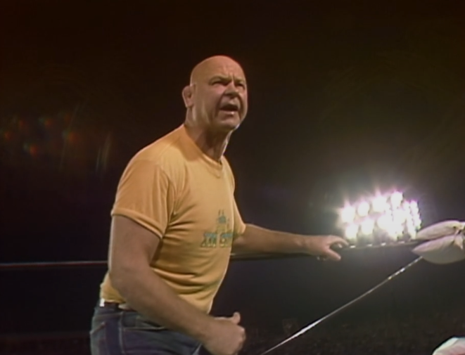Nelson Royal is this ancient cowboy gimmicked guy. You may remember him…if you’re in your 70s. He had more success as a trainer and was responsible for training the likes of Rockin’ Rebel, Johnny Ace and Ken Shamrock. The idea here is for him to be a mentor to young gun Sam Houston. But it’s like sticking Shawn Michaels with Jose Lothario. Houston was young and relatively cool. He didn’t need his lame cowboy gimmick uncle hanging around with him. The Andersons pick off Houston and use all their dark arts to beat the shit out of him. Nelson’s quirks include not wanting to sell for Arn at all before screaming after Ole lobs him into the buckles. He’s such a weirdly grotesque little man.