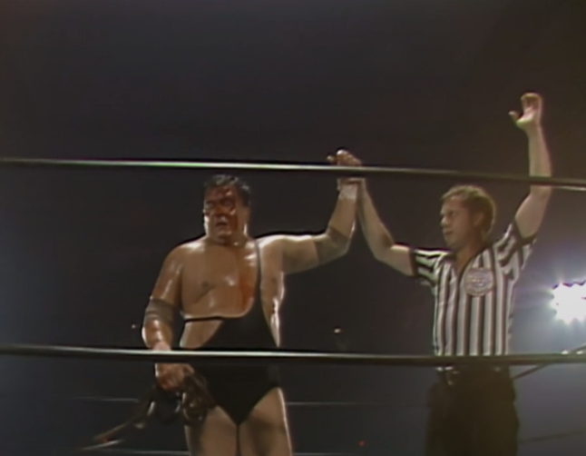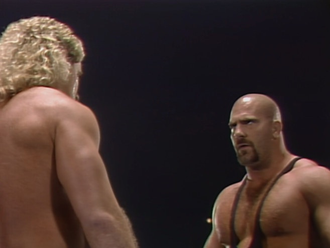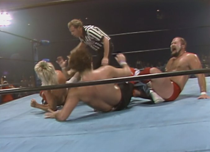 R2 isn’t much better with a wobbly legged Tully eating punches, swinging wildly (mostly at Earl Hebner) and taking near losses. R3 is better for Tully as he runs Garvin into the buckles and is able to dominate after that. Until he goes after Wahoo at ringside, which gets him atomic dropped into a Ronnie punch. How is that not a DQ? JJ Dillon is very involved in the match. He slops Wahoo with the water bucket, so he can sneak a foreign object to Tully. Wahoo gets his revenge on JJ, and he’s bleeding too, but the foreign object has done its job and Blanchard wins on KO. A contrast to the first match where Tully couldn’t get anything at all. Here he, once again, got waffled from pillar to post but at least understood the rules and how to break them. ***½
