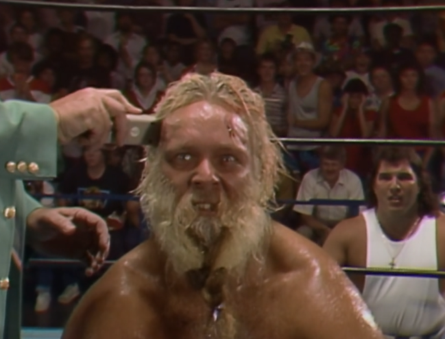 This is a repeat of the other Wahoo vs. Garvin match in Charlotte. I hated that match. Precious requests the fans not smoke during Jimmy’s match. She was progressive and ahead of her time. Garvin takes forever to get going so Wahoo hits him with the strap. Precious complains so Wahoo straps her across the butt and the crowd comes unglued. Wrestling fans always love misogyny. Jimmy Garvin is the kind of guy who would have been a great fit for WWF in this era. He’s a clear sports entertainer, who just does goofy shit. He never seems to be harmed by a loss and would have been effectively used by McMahon, you would think. Wahoo blades and starts beating the piss out of Jimmy. Is Wahoo hot here? His chops suggest there’s hidden beef. Wahoo collects buckles with his head again, which I’m pretty sure isn’t in the rules. I’ve never seen anyone else do it. As with the last time, Precious tries to batter Wahoo but he just ignores her and finishes collecting buckles. Both guys bled loads and nothing much happened. Slightly better than their last match with the same stipulation.