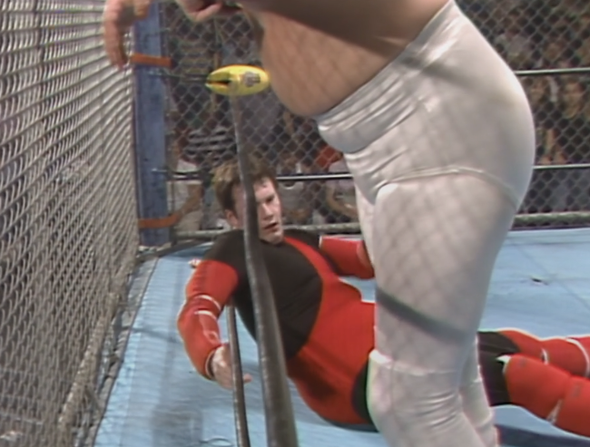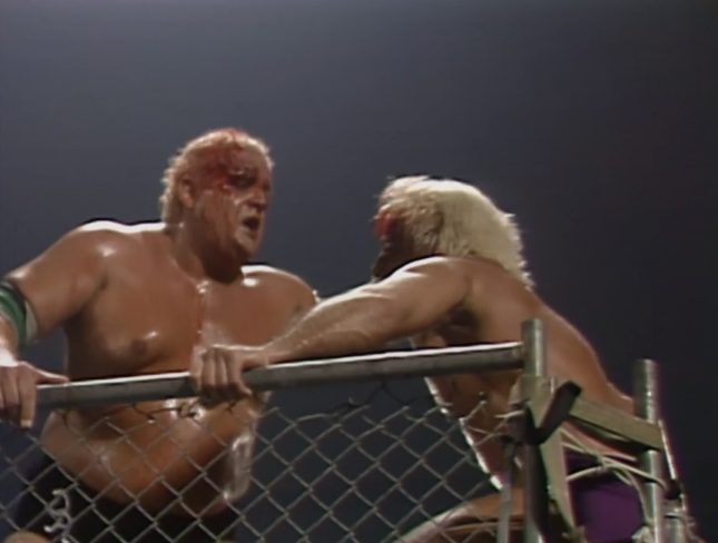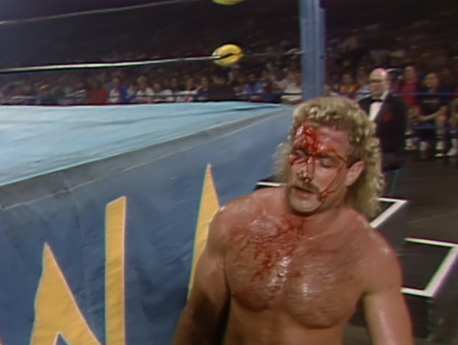 This time it’s in a cage so Flair can’t get deliberately disqualified by throwing Dusty over the top rope. We avoid the famous Dusty Finish by nature of having the cage to prevent DQs and count outs and such. To this point I’ve only really liked one Flair-Rhodes match, from the Crockett Cup, which was a bloody mess. Speaking of blood, Dusty gigs in this one too.