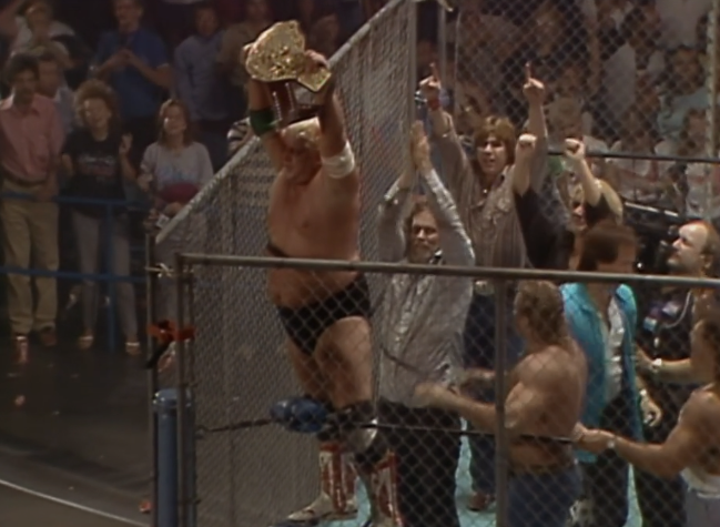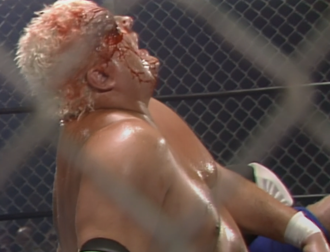As you can see Flair blades and there has been so much blood on this show. I’m almost numb to it at this point. It’s interesting that Flair lifts the crossbody off the cage, which he beat Harley Race with back in 1983, and Dusty just kicks out at his leisure. Harley was in WWF at the time, so that’s probably fair play. Dusty has no big statement move to get the job done, he just catches Flair in an inside cradle for the pin. That’s Dusty’s third and final world title. **¾