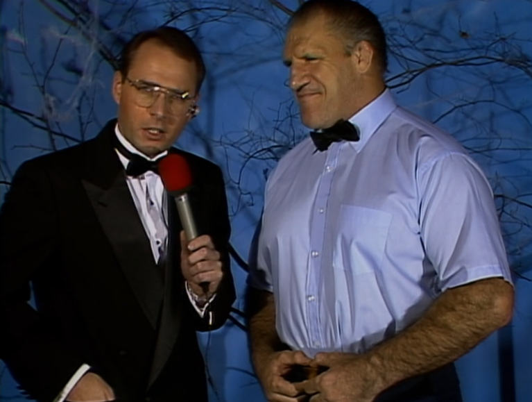 We return with Bruno Sammartino. He had been working for the WWF up to 1988, a year after his official retirement. Suddenly, he started to disapprove of the WWF’s brand of wrestling. Maybe he saw one too many guys shooting steroids into their buttocks. One of his main concerns with the WWF related to rampant drug use among the roster. It is worth noting that many guys from his era are now dead and a lot of them were drug related deaths. Bruno is here to shill the NWA and says the Thunderdome is a “very dangerous match”. Given his powerful pro-NWA shilling here, it’s surprising he didn’t pop up in WCW more often. Although a lot of shambolic stuff he criticised the WWF for also becoming prevalent in WCW.