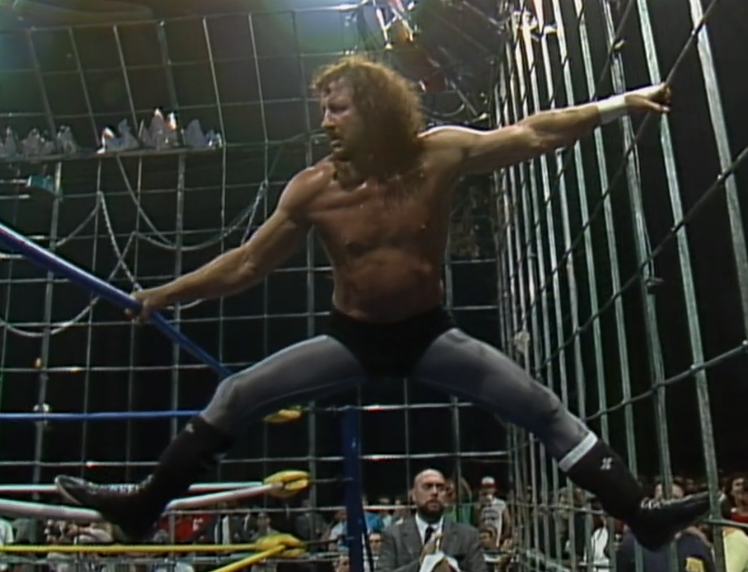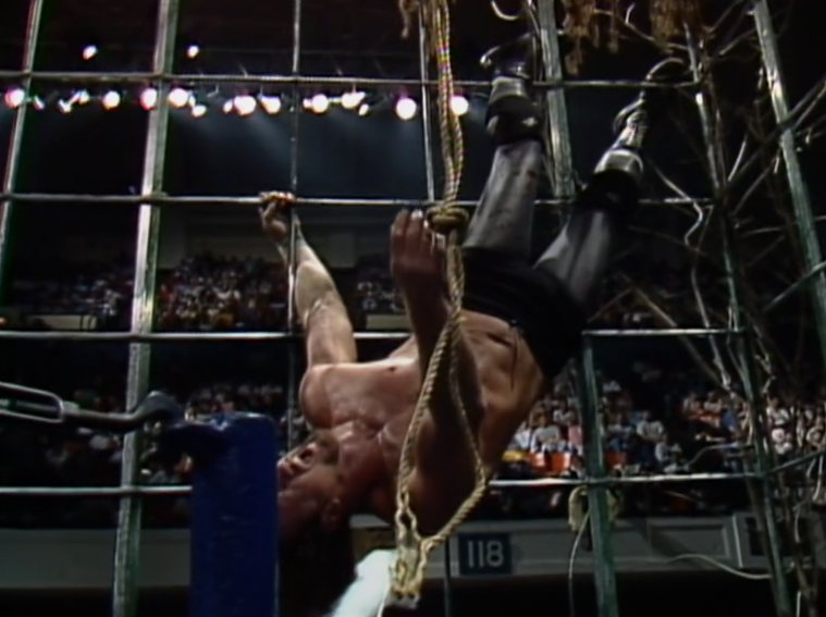 Sting gets tied to the cage and the others go to town on Flair’s neck. Sting eventually saves so Muta heads up top again. This time they’ve turned off the electricity. It’s so funny they ran a live current through the cage. I respect it. “Watch Muta, watch Muta” shouts Jim as the camera cuts away from him. There’s a loud pop but I have no idea what happened. Bruno punches Muta out of the ring for some reason. Funk gets trapped in the Figure Four and Ole decks Gary Hart, sending the towel flying into the ring.