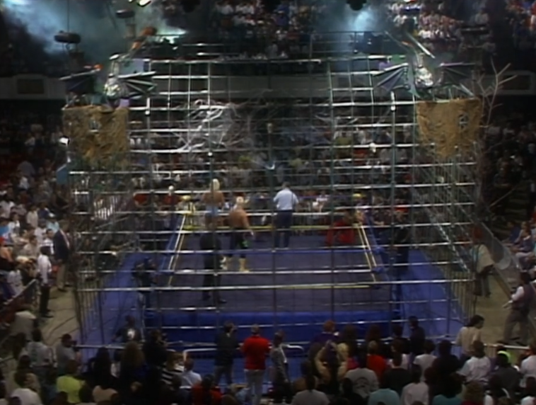 The cage itself is bigger than usual and is curved in at the top to prevent climbing out. The WWF would go a step further and create Hell in a Cell, but this cage gives us space to play around ringside, a key element of the Cell matches. However, because this is WCW (and Halloween), they’ve electrified the top of the cage.