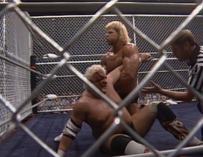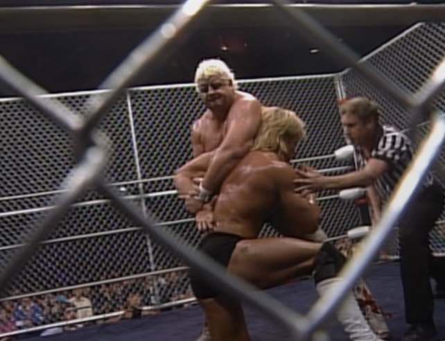 They end up in the same spot but Garvin hits a high crossbody, instead of the sunset flip that won him the belt. That is the spot that Flair won the title with at Starrcade ‘83. We’ll call it a tribute. Garvin continues to wallop Flair with those chops. Say what you like about Garvin, but he hit like a motherfucker. Hands of Stone! They do a repeat of the set up for the sunset flip, which is how Garvin won the belt, but this time Flair grabs the ropes to block it. The last few minutes of this are HOT. The crowd are so into it. Garvin accidentally flies into the cage and Flair pins him for the win and the title. ***¾. This has a bad rap, but it fucks. Maybe it’s because Flair deviates from his more obvious formula and maybe it’s because Garvin stiffs the hell out of him, but I loved this. Easily MOTN and almost enough to save the show.
