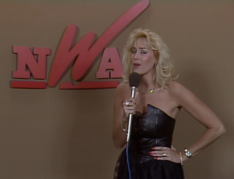 Missy Hyatt officially welcomes us to Starrcade. What is with that NWA logo? It looks like the W is trying to escape.