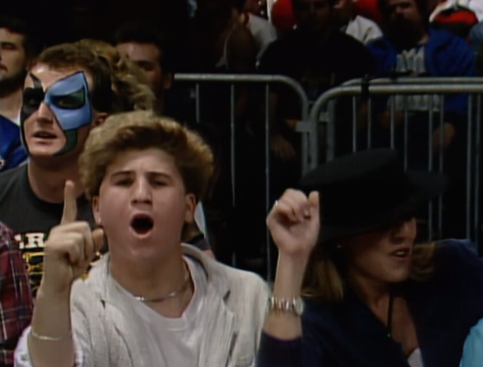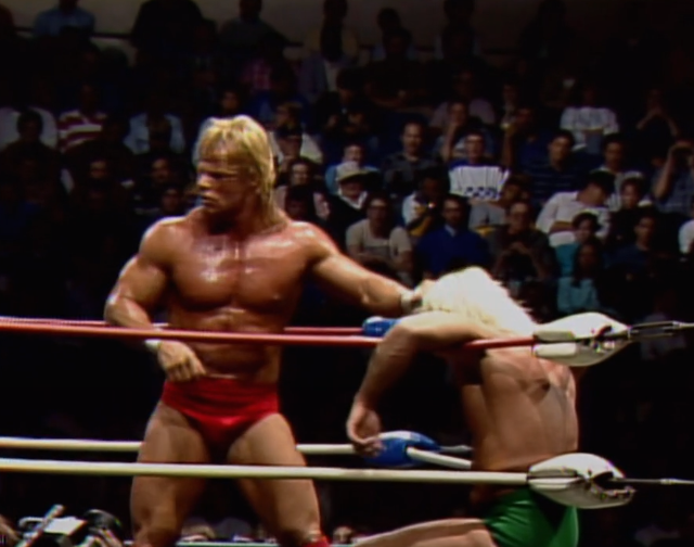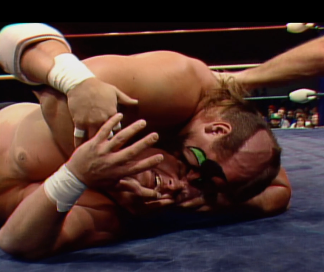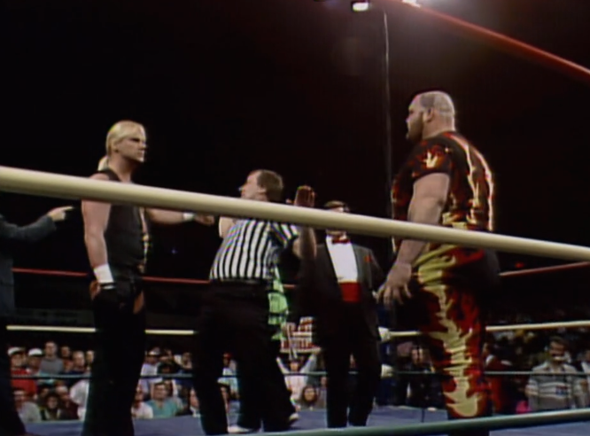 Rick has gotten over by being a simpleton babyface, crossed by his original heel running buddies. To ensure fairness Kevin Sullivan is in the shark cage again. This time they actually elevate it, so he can’t screw with anyone. Although his complex machinations would probably be lost on Steiner. Maybe he could have gotten in Alex’s head?