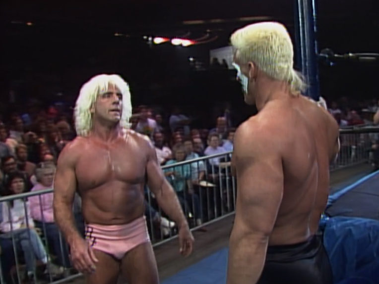 Flair lights Luger up with the chops and boy, are those satisfying sounding. Meanwhile, this is Luger before he’s flip-flopped on the turns, and it’s become apparent that he’s just not good at carrying over personality from heel to face. This heel run is Luger at his level best. He does a great job at taking a beating from Flair. The combination of chops and roll ups is golden.