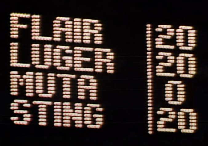GMC claims we’re at 13:00 and we’re really not mate. I don’t know who the timekeeper is, but he’s not good at his job. Luger can barely stand so Muta, genius that he is, blows mist his face for the DQ. What a god-awful finish that is. The match was boring and these two had no chemistry at all. Lex finishes on 35 points, meaning whoever wins the main event wins the whole thing.