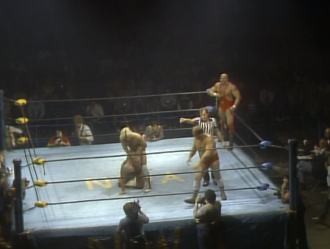 The faces spend half the match isolating Ivan and working his arm. It’s the Anderson Way. Nikita was ahead of his time. A big powerful, muscular guy. The trouble is…he can’t do anything. Someone taught him a bearhug and now he’s more hug than man. He is useless here. Ivan and Ole just work around him. At least Larson can keep up with the flow of the match, Nikita has nothing. My favourite thing about Nikita is that he learned to speak Russian to get the character over. Which is better than that ugly prick El Ligero just saying “si” instead of learning Spanish. Ivan waffles Larson with the old International Object for the pin. This was fun, apart from the Nikita Koloff extended bore-hugs. **½