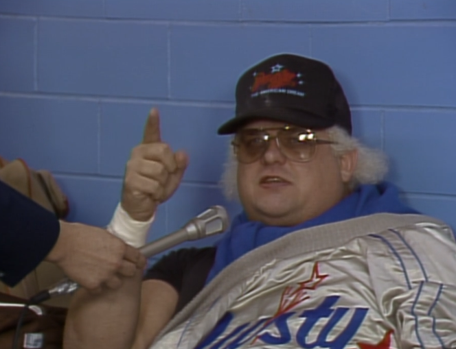 Dusty Rhodes rambles about various things. He points at camera A LOT. Tony seems to have interviewed him during his nap time, which explains why he has a coat over himself.