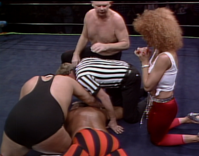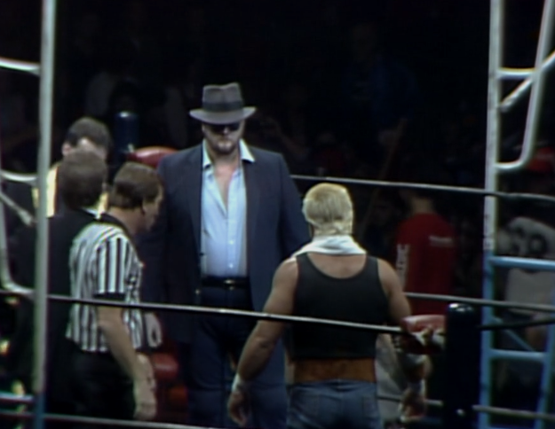 Apparently, this is where Jim Cornette hurt his knee. He slipped off the apron after hitting Garvin with the tennis racket. That tore his ACL. Then he fell off the scaffold later in the evening and that properly fucked it up.