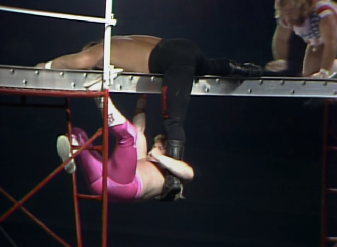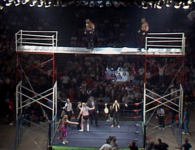 They can’t do anything on the scaffold because there’s no space. The best you can hope for is tentative brawling and they can’t even do that because no one can move around. The space is just too small. It does freak a lot of people out watching it but fuck me, it’s a dreadful match.