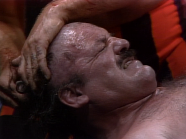 Dusty has shaved his head at the sides and written “Tully” on there. I don’t know what that signifies? If anything, it means Tully is in his head. This is all antics, zero action. Tully tries to wear amateur headgear, but Earl Hebner makes him take it off. JJ’s next gambit is covering Tully’s face in Vaseline but Earl rubs that off too. JJ and Dusty get into it and Rhodes elbows Dillon, busting him open. The idea being that Dusty’s elbow strike is enough to open someone up.