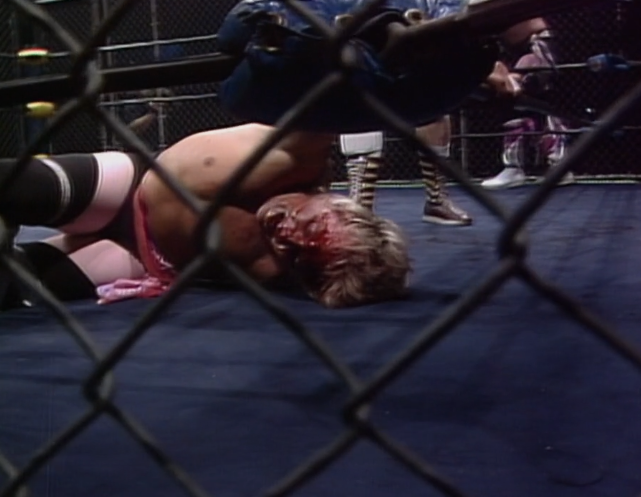 Ricky proceeds to get the piss beaten out of him. Morton is so good at saying “no” when he’s in a hold and just dragging the crowd into the action. The loud shrill noise that greets every hint of a comeback is wonderful. They beat the hell out of Ricky Morton here. It’s sensational. Just when you think it’s over and he’s going to catch a break, he’s face first into the cage again. The way he keeps the fans waiting for that tag is masterful, from everyone.