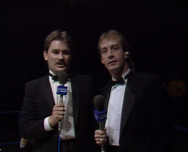Hosts are Bob Caudle & Johnny Weaver in Greensboro and Tony Schiavone & Rick Stewart in Atlanta. Who the fuck is Rick Stewart? The only thing I know about Stewart is he hosted “All Star Wrestling” for Central States. Crockett bought out Central States wrestling and Stewart was part of the commentary team for a while but there’s nothing after Starrcade ‘86. Here today, gone tomorrow.