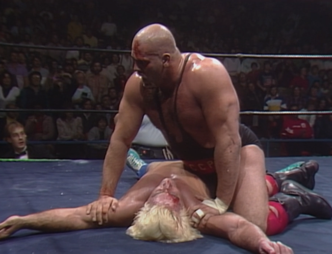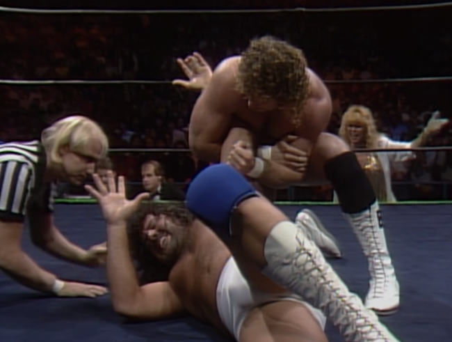 Which creates an easy story of Tully fearing taking one of those elbows. Both guys cover up and run from each other. Dusty throws all of this psychology away by randomly working the leg. First Blood match Big Dust, not first knee bar match. They work in a dumb ref bump to allow Dusty to open Tully up with JJ Dillon’s shoe. Earl is still down so JJ towels Blanchard’s blood off and Tully socks Dusty with a roll of quarters to bust him open and, of course, Earl sees this immediately and awards the match to Tully. Dusty, a big petulant baby who’s been outsmarted, throws a tantrum after the match. **½. The psychology was fascinating, and the finish is one of the most interesting things about the match. JJ Dillon earning his coin both through support of Tully and by selling the gimmick of the match and Dusty’s strikes. I liked this quite a bit but also got annoyed that Dusty gave himself so much to work with here and yet his booked finishes of title matches elsewhere were lazy and stupid by comparison. It just made me mad at the whole era. Look at tonight’s main event for a prime example.
