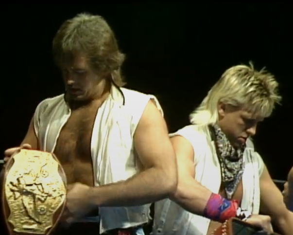 The Rocket Launcher misses and Morton hot tags in and Eaton is the master of being in the right place to look stupid. The ref? Pee Wee Anderson? Less so. He gets bumped. Cornette gets dragged in there. Morton takes too long to hit him and gets bonked in the back of the head with the tennis racket. Pee Wee recovers and Morton is still out cold. The Midnight’s win the belts! This was the only time this combination won the titles. ***½. I liked this but Dennis Condrey just kills the match in the middle with a long chinlock. Get rid of that and have the Midnights cheating more and this flies up the ratings.