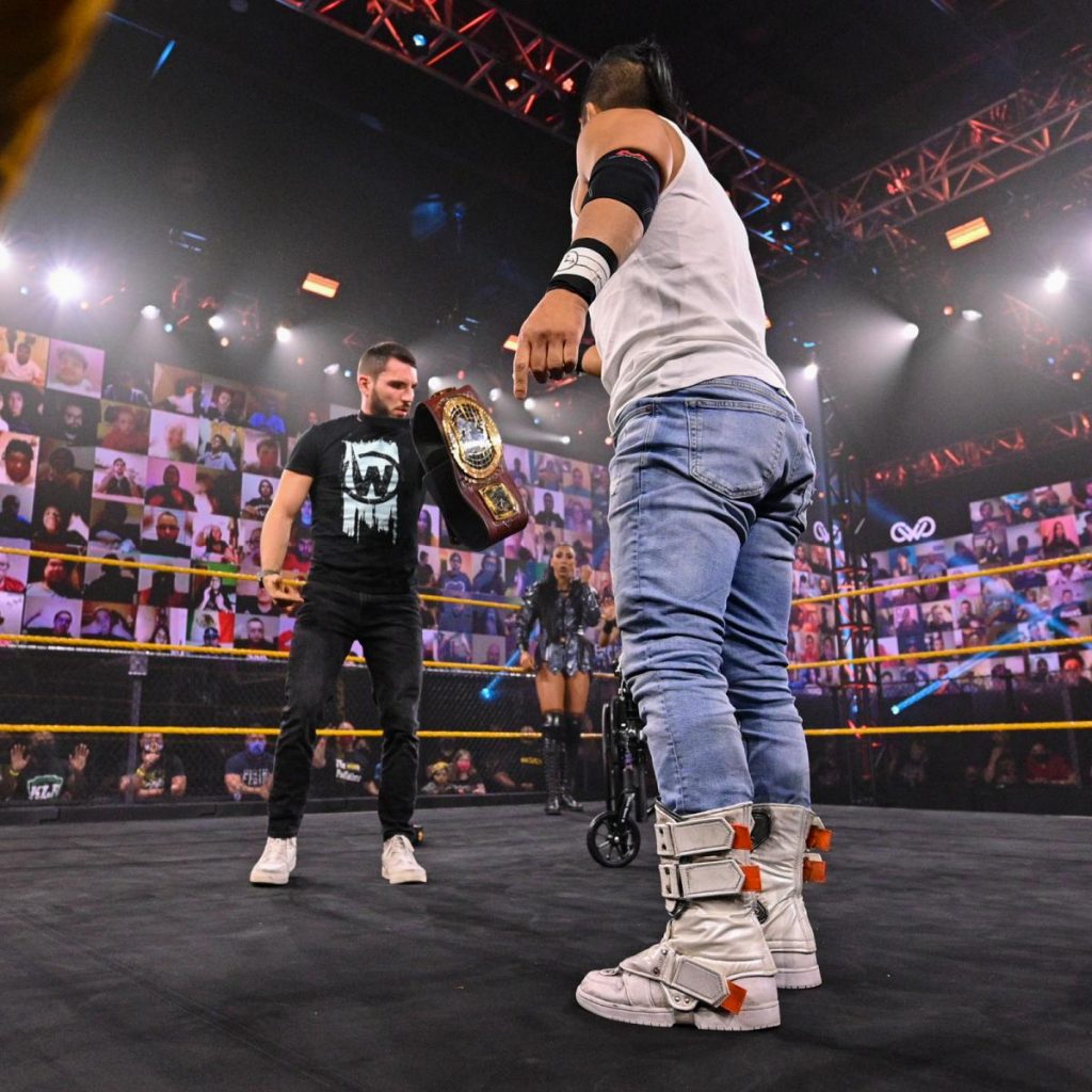 When Regal’s question made Theory notice him, Kushida punched him and tried to wrench the title out of Gargano’s hands. Johnny Gargano kept hold of it, pulling hard with both arms until he stood up from the wheelchair. Kushida punched him straight back into it and Indi Hartwell had to hold Candice LeRae back. He stood there with his hands up while LeRae tried to fight free, then Ember Moon and Shotzi Blackheart arrived in Blackheart’s tank.