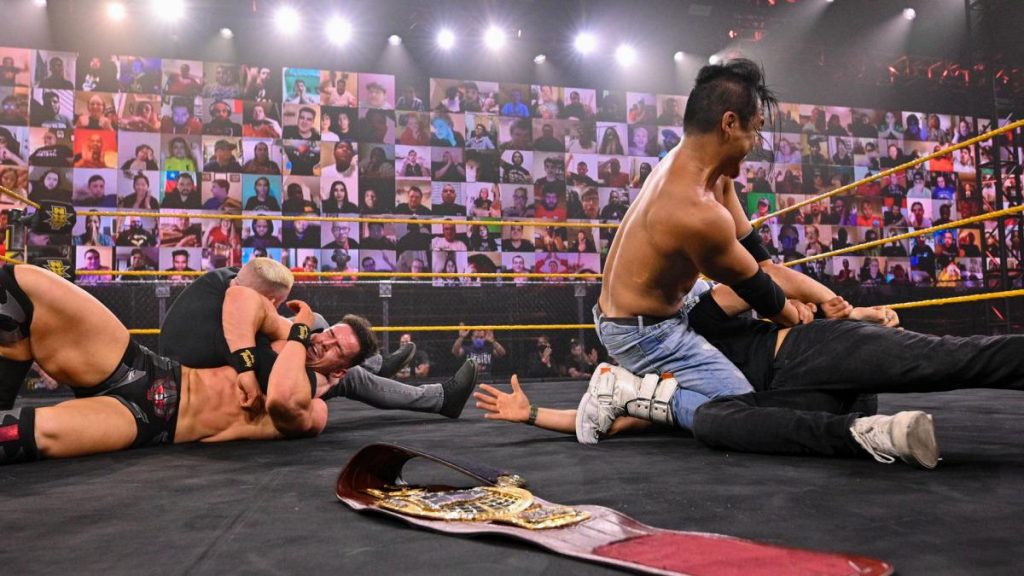 Kushida got the hoverboard lock on Gargano after Gargano prised him off Theory, and before Theory could return the favour, Lumis locked on The Silence.